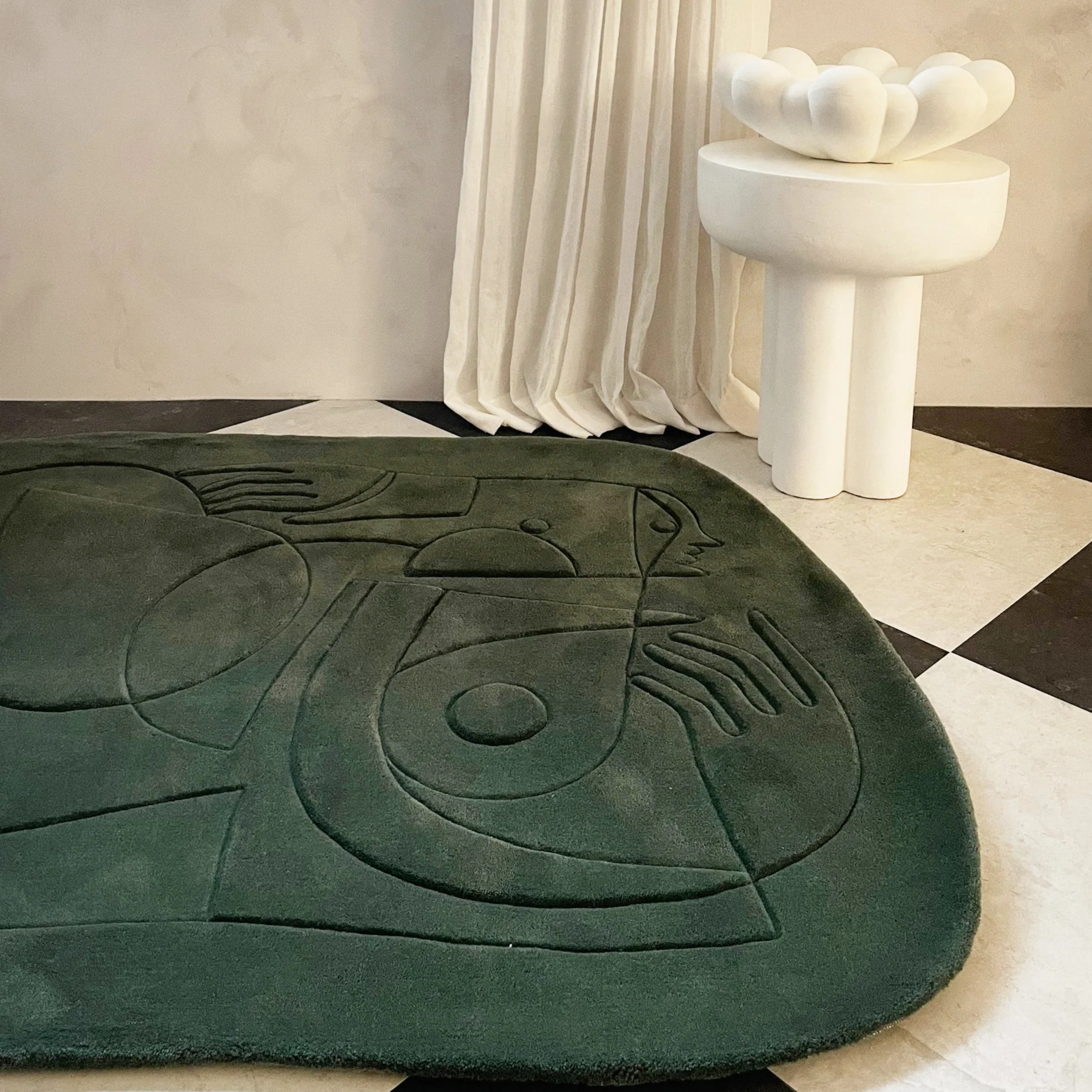 We reinterpreted her drawings and created high quality art rugs. Now you can incorporate her art in different scales and shapes in every space.Â