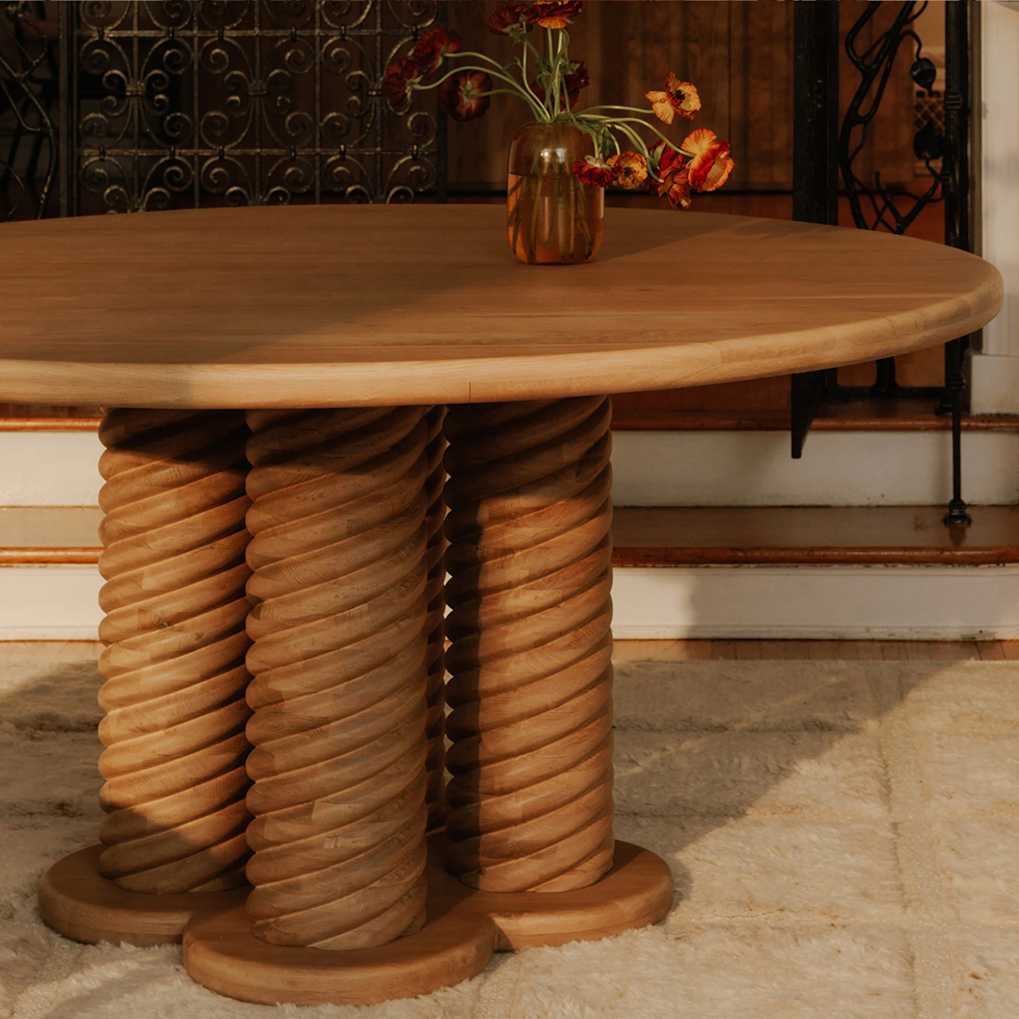 The Charlotte dining table is a contemporary reimagining of traditional aesthetics through turned and braided design details. This table showcases exaggerated, intricate detailing on its pedestal base, infusing it with a modern boldness while maintaining functional elegance. The pedestal style is visually striking and exceptionally practical, offering unobstructed space for comfortable seating and effortless conversation.