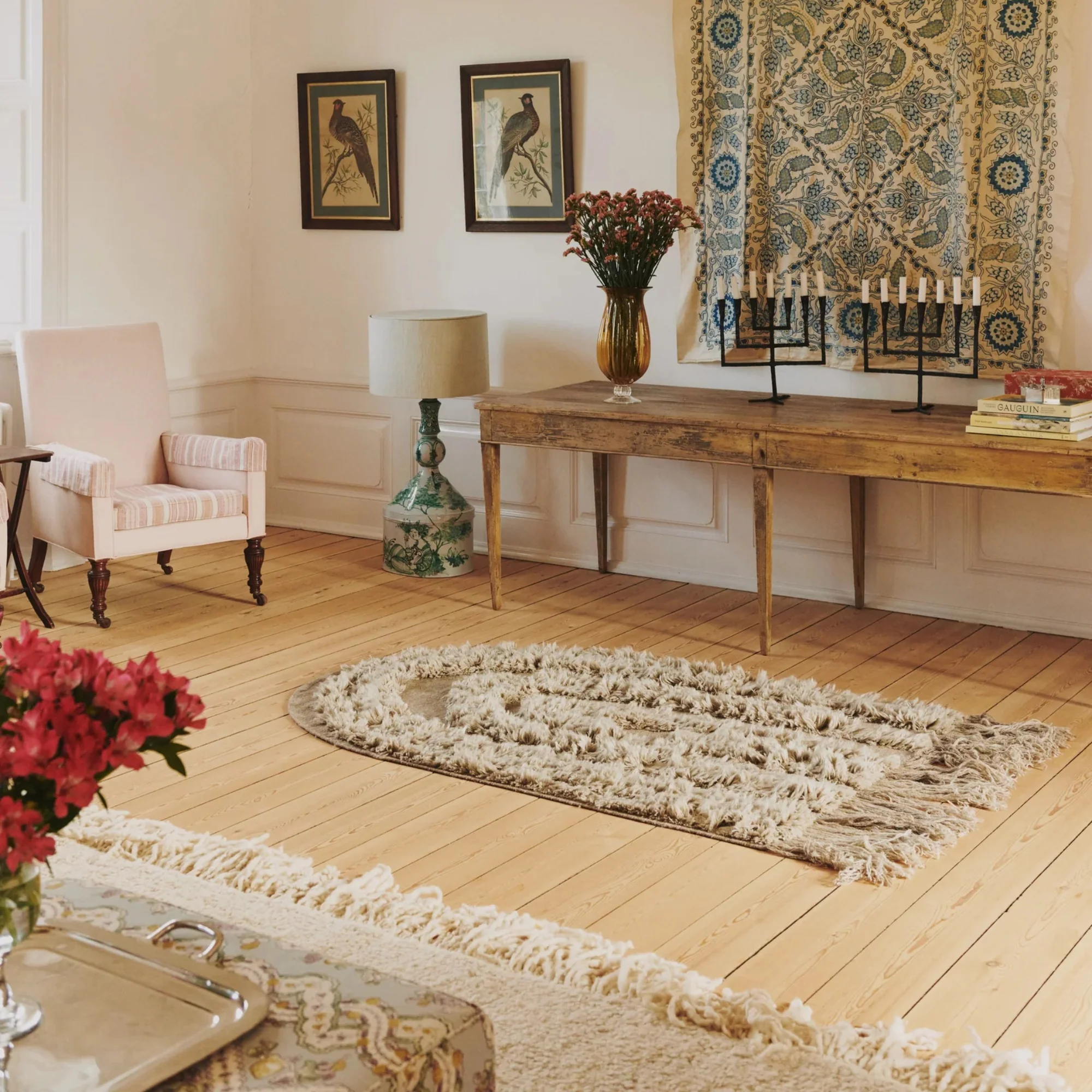 no.28 is an updated version of the iconic no.01, where a soft darker beige tone creates a subtle yet decorative statement piece. The rug can be hung on the wall or used as a classic floor rug. The curved triumph in low and high pile lengths create a poetic and bohemian pattern. A long fringe edge elevates the end line and adds an artistic detail.