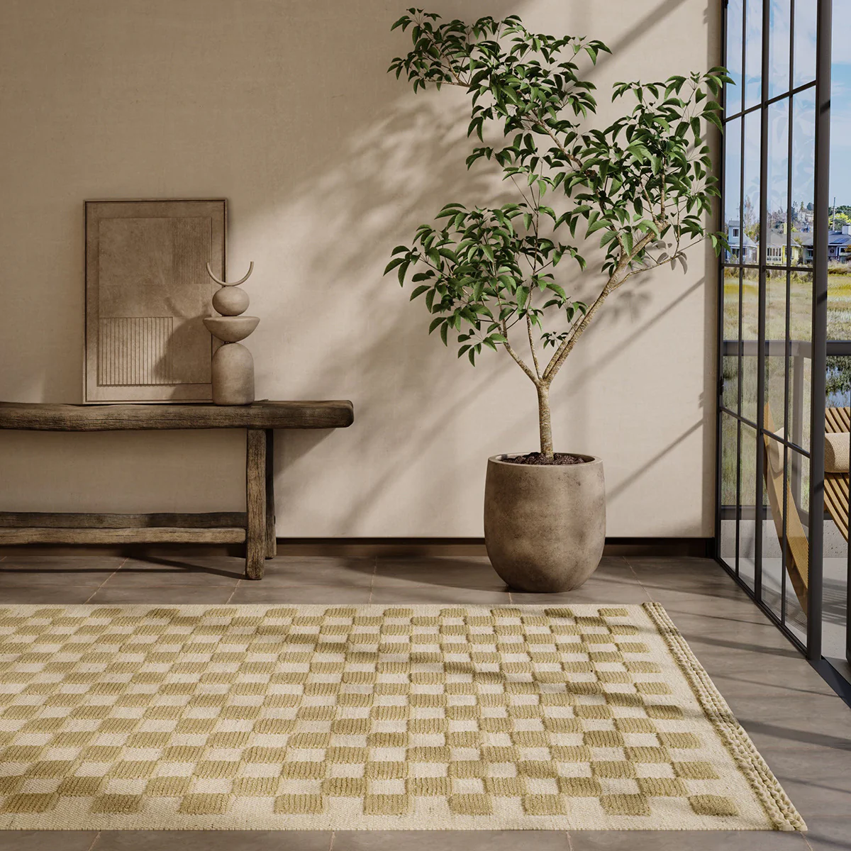 Flat-woven with pile, this design provides a unique interpretation of the pattern while adding in braided stripe edges. Since the warm autumn hue is inspired by nature, it feels timeless and versatile. Made of 100-percent wool and handwoven in India, the global influence can be felt in every aspect of the design.